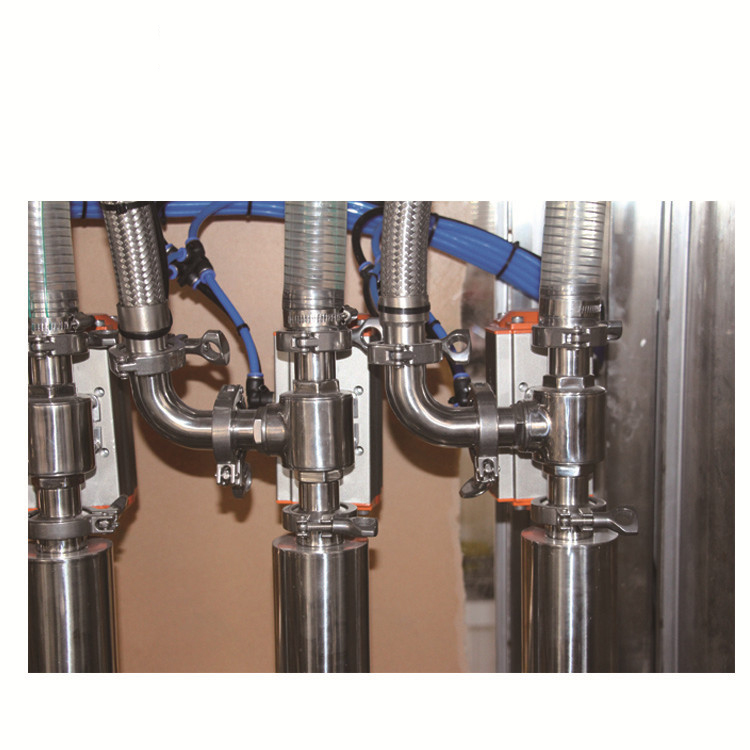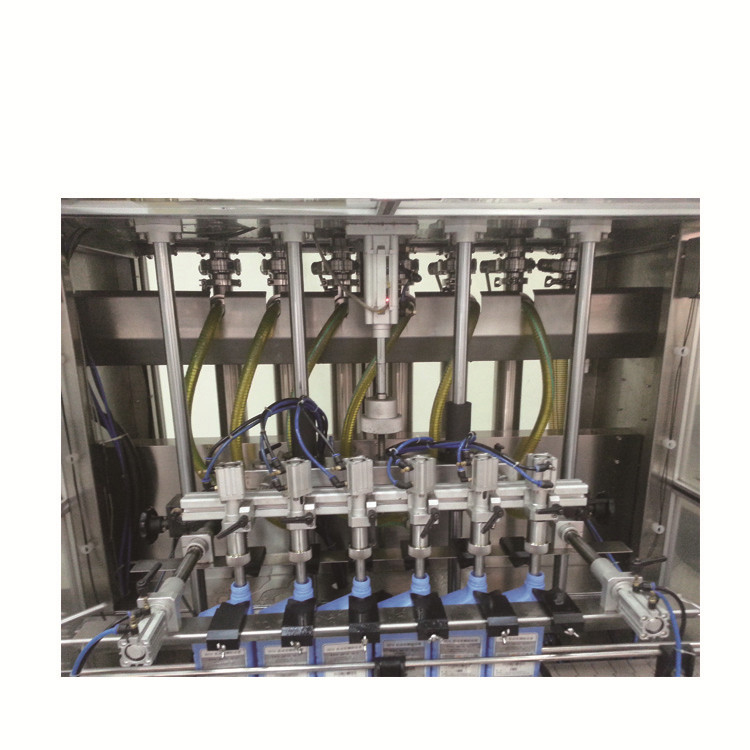Obrotowy stół podający dostarcza butelki po kolei do ruchomego przenośnika SS. Butelki wchodzą do punktu napełniania przez przenośnik SS. Napełnianie dyszy wlać do butelki wcześniej ustawioną objętość płynu. Sześciokątny blok dozujący śruby umożliwia łatwe użycie różnych objętości napełnienia przy minimalnym czasie. Główny napęd składa się ze skrzyni biegów napędzanej silnikiem prądu przemiennego i sterowanej przez przemiennik częstotliwości prądu przemiennego. Szybkość można ustawić w kategoriach butelek na minutę. Napęd przenośnika składa się z motoreduktora z wałkiem Hallow, sterowanego przez przemiennik częstotliwości AC. Pokrętło może ustawić prędkość przenośnika.